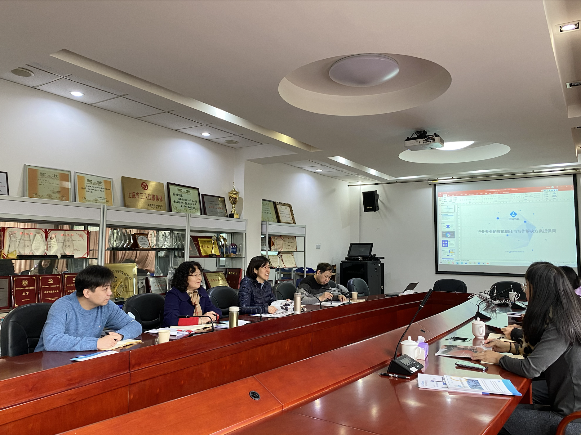 会上,刘芹教授、韩戈玲教授、姜诚副教授与张井总经理一道展开深切讨论,提议将机器翻译译后编辑纳入教学培养方案之中,以紧跟时代脚步,真正做到科技为翻译赋能。最后,双方就未来深度合作表明殷切期待,并就逐步落实产学研一体化提出大致方案。