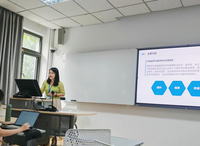 次日,三位教师参加了主题为“大模型时代的翻译研究与教学创新”的“北外人工智能翻译研究创新发展高端论坛”。论坛汇聚了高校、科研机构和产业界的专家学者,共同探讨人机协同背景下翻译学科的范式重塑。上海外国语大学胡开宝教授阐述了大语言模型对译者研究带来的变革,强调未来翻译实践将呈现“人机共舞”模式,需平衡技术工具理性与人文价值理性。中国科学院自动化研究所宗成庆研究员分析了机器翻译在跨语系和低资源语境下的现存短板,呼吁外语教学需综合考量知识结构、专业方向、人文素养及计算机软硬件条件。《上海翻译》主编傅敬民教授探讨了翻译研究范式的重构路径,提出需融合技术要素,兼顾人机优势。产业界代表传神公司副总裁闫栗丽则分享了“课程—项目—标准—平台”联动的人才培养模式,突出了项目化教学和行业评价体系的应用价值。论坛最终达成共识:翻译是一项综合性实践工程,需在“研究—教学—应用”三个层面协同发力,以高质量数据资源、可复用工具平台与可评估的质量体系推动AI翻译创新发展。