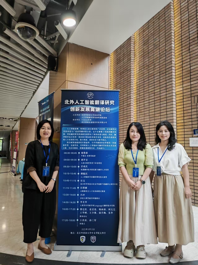 2025年9月11日至13日,威廉希尔williamhill英语系(科技翻译)邬菊艳、韩洋和安竹筠三位教师赴北京外国语大学开展专项调研,并参与高端论坛,聚焦人工智能(AI)技术与翻译课程的深度融合。此行旨在通过与专家深入交流和高水平论坛研讨,探索AI赋能课程建设的新模式,以应对翻译行业智能化转型的需求。