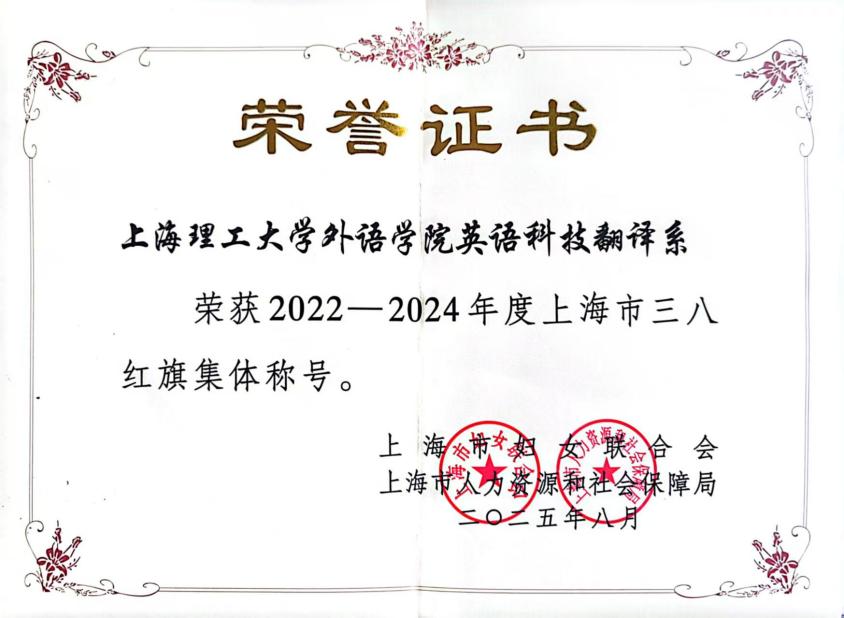 近日,上海市妇女联合会与上海市人力资源和社会保障局联合公布了2022-2024年度上海市三八红旗手(集体)表彰名单,我院英语科技翻译系凭借卓越的教学科研成就和突出的社会贡献,被授予“上海市三八红旗集体”荣誉称号。这一荣誉彰显了该系在高等教育领域的引领作用,以及女性教师团队在推动学科创新和服务国家战略中的关键角色。
